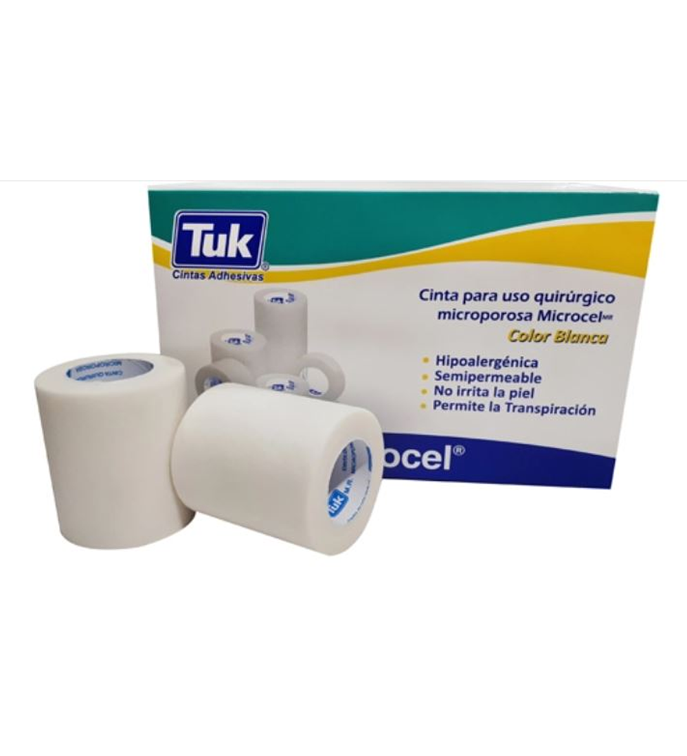 Cinta hipoalergénica microporosa con respaldo de tela no-tejida, que permite la transpiración reduciendo a un mínimo las reacciones alérgicas de la piel.