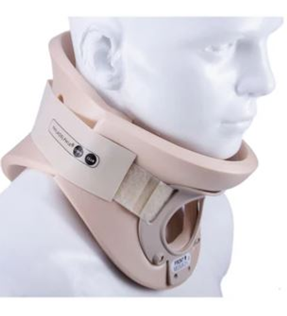 Collar cervical anatómico al cuello elaborado en plastazote con ajustadores laterales en velcro y orificio anterior para traqueotomía, descanso en mentón y soporte en pecho suave.