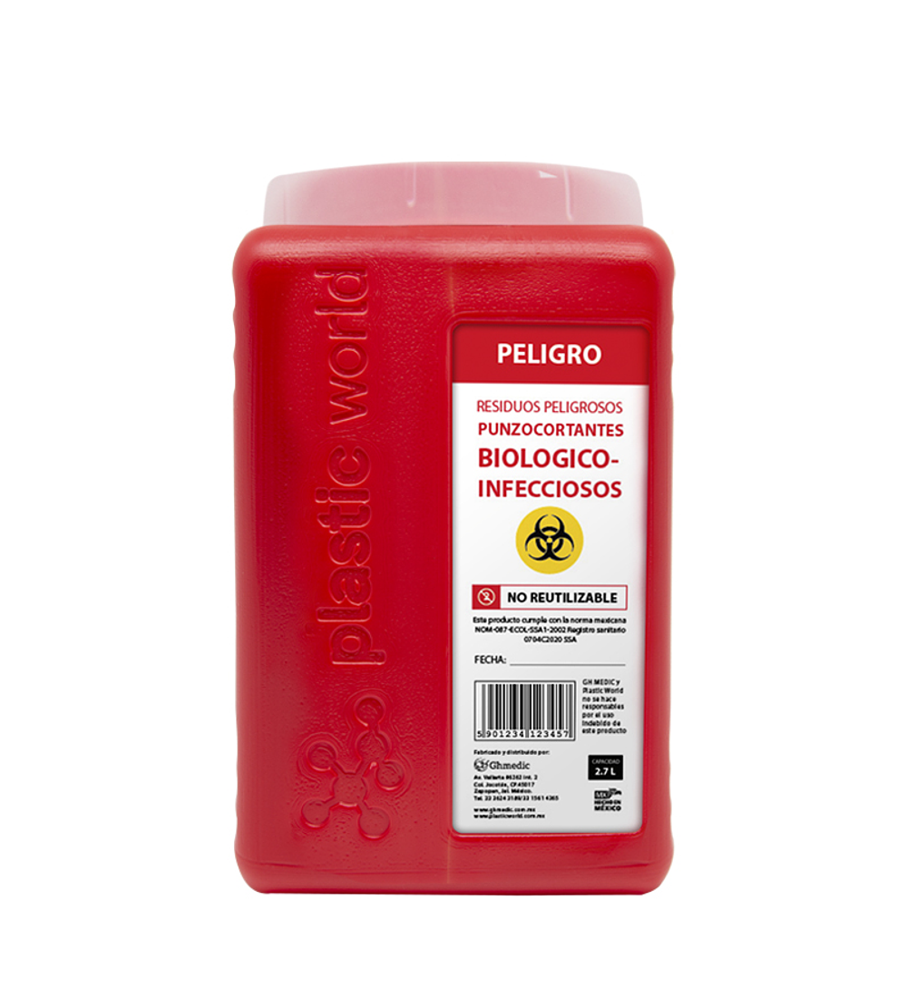 Recolector de punzocortantes, resistente a la perforación, al impacto y a la pérdida de contenido. Fabricado de polietileno. Para desecho de material de riesgo biológico infeccioso. Esterilizable, incinerable y no contaminante.